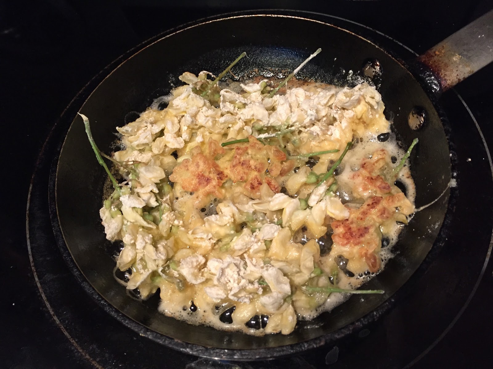 Slack and I had a bite and thought they tasted great. We agree with the Peterson Field guide that the flower clusters make excellent fritters! I think sprinkling them with confectioners sugar would make them even better. Happy foraging!